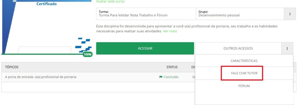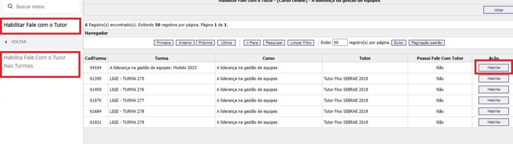 No menu Curricular>>Habilitar o Fale com o tutor, habilitamos a exibição do fale com o tutor na plataforma para cursos e trilhas. Selecione o curso/trilha, clique em “Habilitar”, para que o menu do Fale com o tutor seja exibido no ambiente aluno.