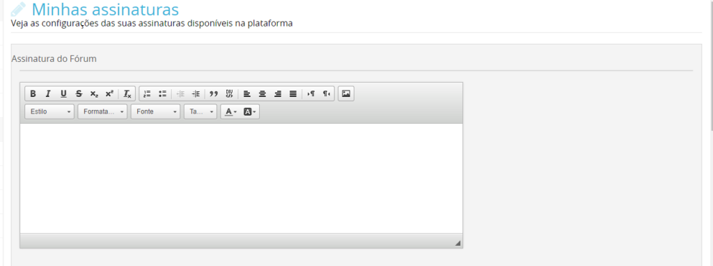 Minhas Assinaturas Através do menu Administrativo >> Usuários >> Minhas Assinaturas, você poderá criar assinaturas nas mensagens do Fórum, Central de Mensagens e Newsletter. Preencha o campo de texto e clique em Salvar. Atualizado em outubro 28, 2020 Este artigo foi útil? Sim Não