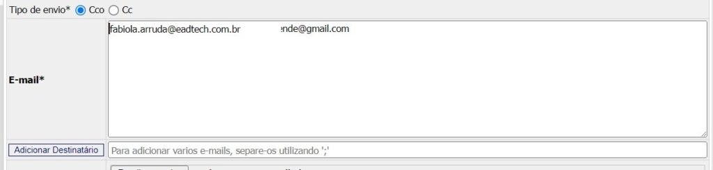 Após preencher os filtros desejados, acione o botão Pesquisar Informações para visualizar o resultado da pesquisa. Este resultado irá aparecer na lista “Cco”, isto é, em cópia oculta do e-mail e não poderá ser editado. O campo “Cco” pode ser alterado para “CC”, de forma que todos os usuários visualizem os demais destinatários.