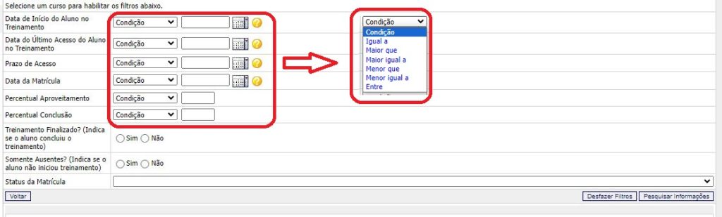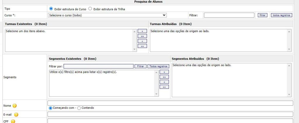 A pesquisa de alunos do curso/trilha selecionada também pode ser feita, por algumas informações de cadastro do aluno: