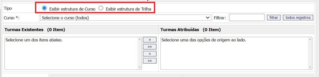 Tipo – exibir estrutura de curso, exibir estrutura de trilha