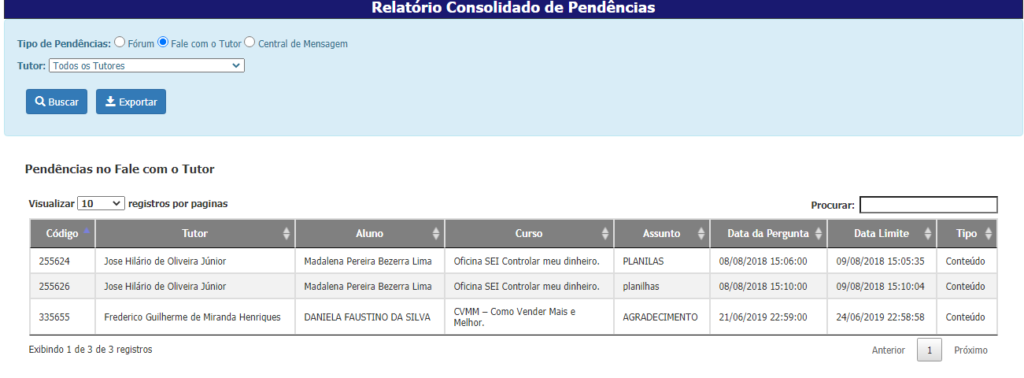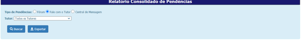 No menu Estatístico >> Relatório de pendências, é possível visualizarmos as pendências de resposta do tutor,nos recursos Fórum, Fale com o Tutor e Central de mensagens.