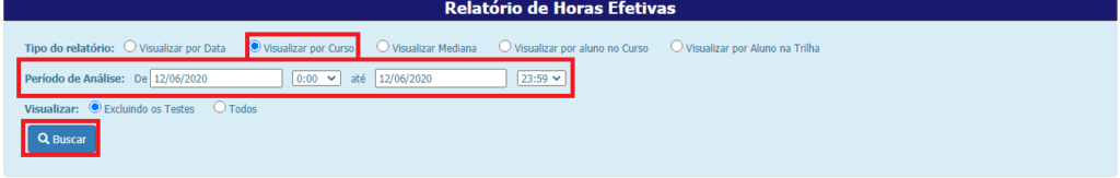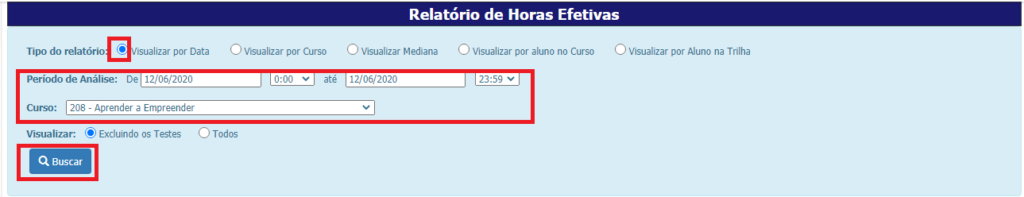 Selecione o tipo de relatório – Visualização por data, período e/ou o curso, clique em Buscar.