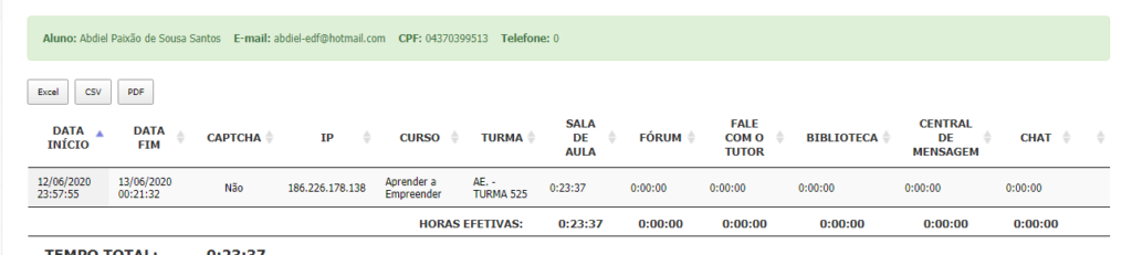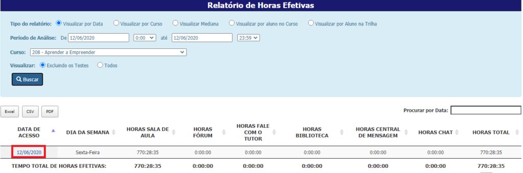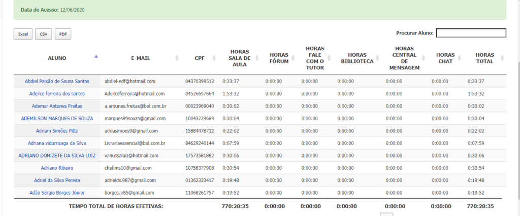 No menu Estatístico >> Horas Efetivas, é exibido o relatório para verificação das horas de acesso dos alunos.