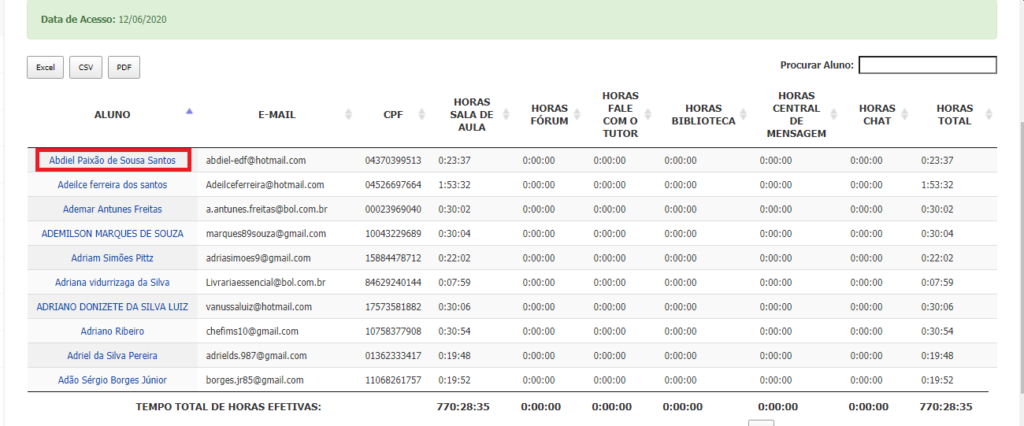 Para verificar as horas efetivas de um aluno específico, clique no nome do aluno.