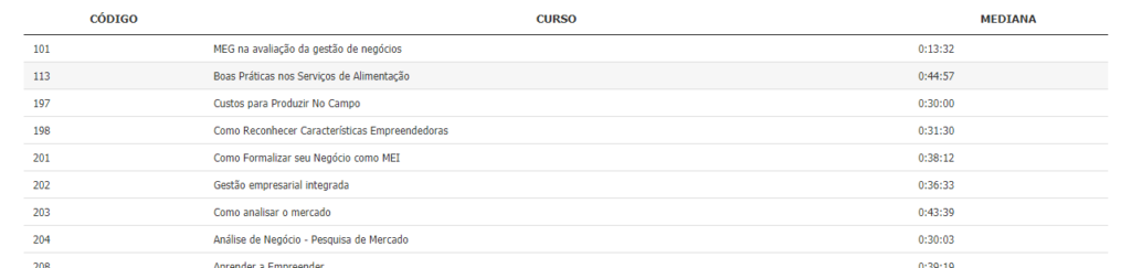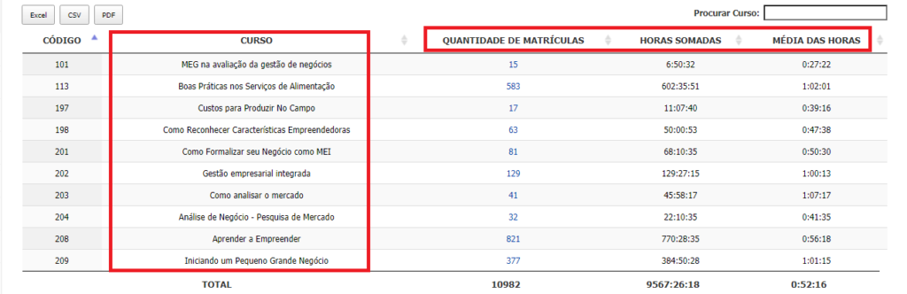 Serão exibidas a quantidade de matrículas, as horas somadas e a média das horas em cada curso.