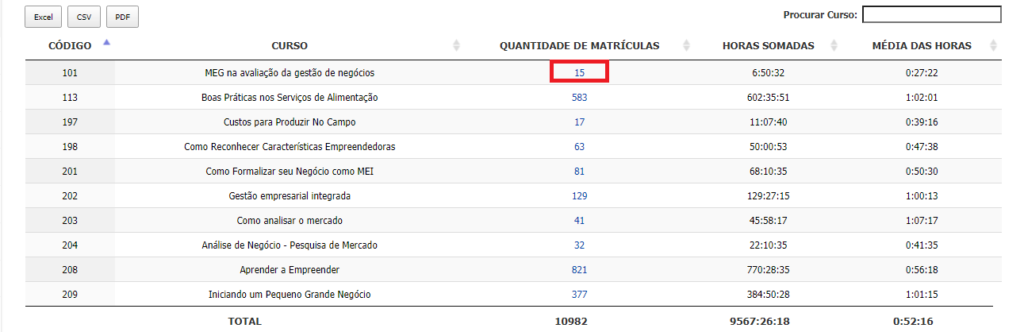 Para verificar as horas específicas dos alunos do curso, clique no total de matrículas.