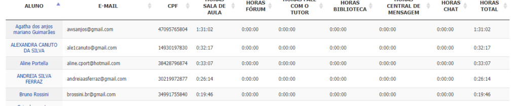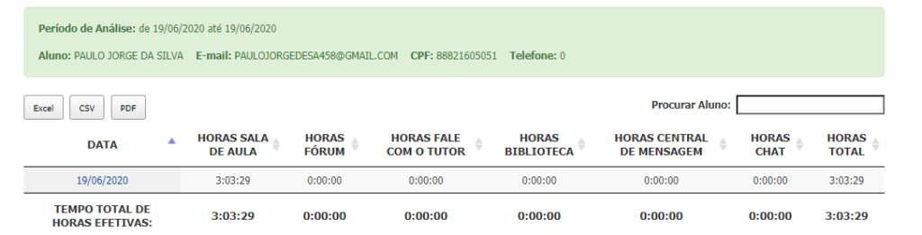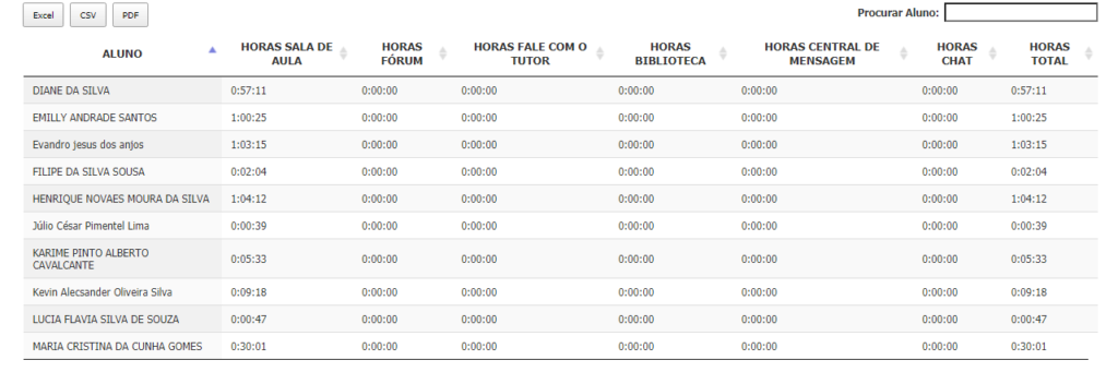 Serão exibidas as horas de acesso do aluno de acordo com os filtros aplicados.