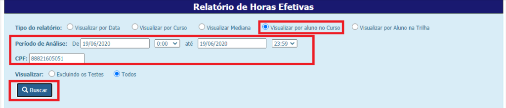 Selecione o tipo de relatório – Visualizar por aluno no curso, o período, o CPF, clique em Buscar.