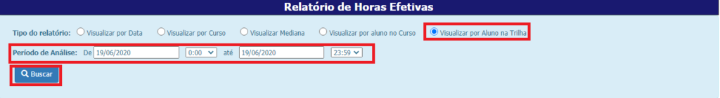 Selecione o tipo de relatório – Visualizar por aluno na trilha, o período, clique em Buscar.