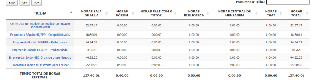 Clique na trilha para verificar as horas efetivas de todos os alunos da trilha.