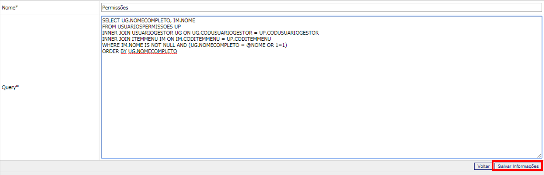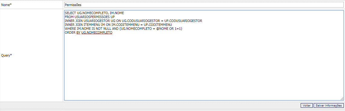 O sistema habilitará o formulário com o nome e a query já cadastrada. Realize as alterações que julgar necessário e clique no botão “Salvar Informações”.