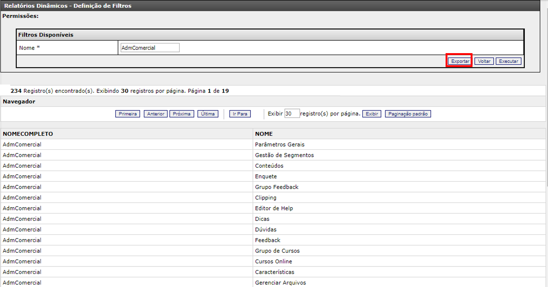 4. Clique no botão “exportar” caso queira extrair o conteúdo do relatório.