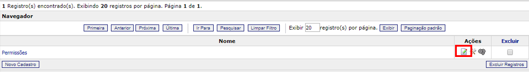 Na listagem de relatórios existentes, clique no ícone “Editar” na coluna “Ações”.