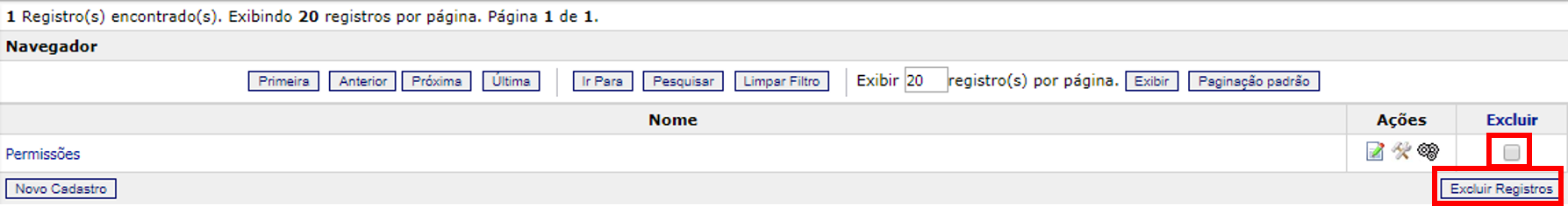 Na coluna “Excluir”, selecione o relatório que deseja excluir e clique no botão “Excluir”.