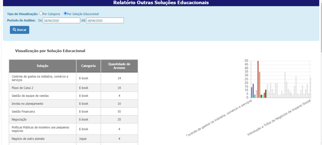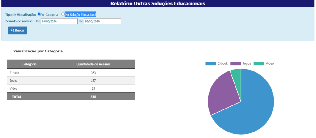 Selecione o tipo de visualizações por categoria, o período e clique em Buscar. Serão exibidos a quantidade de acessos por categoria de soluções educacionais.