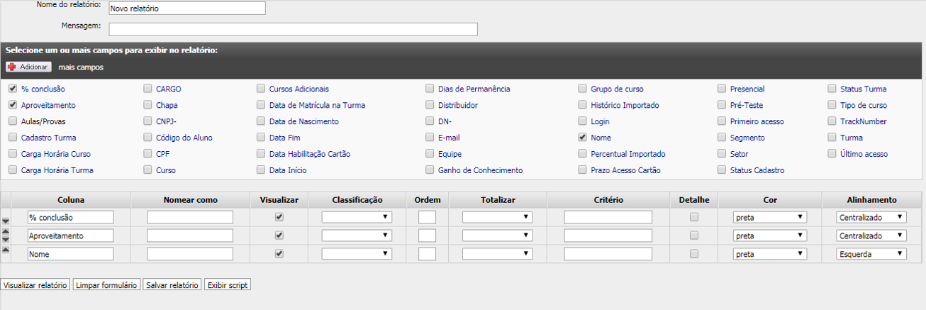 Por meio do recurso Gestor Estatístico » Relatórios Personalizados » Novo você poderá cadastrar relatórios personalizados de “Alunos”, “Estatísticas do Curso”, “Feedback” ou “Situação na turma”. Após definir os itens que constarão no relatório (esses itens irão variar de acordo com o tipo de relatório que você deseja montar) e preenchimento dos campos, o usuário poderá salvá-lo e disponibilizá-lo na área de “Relatórios salvos” (em Gestor Estatístico » Relatórios Personalizados » Relatórios salvos).