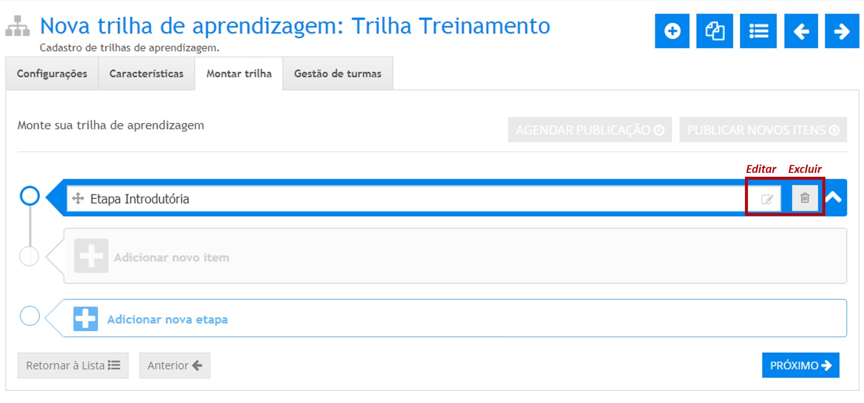 Incluindo Etapas em uma Trilha de Aprendizagem