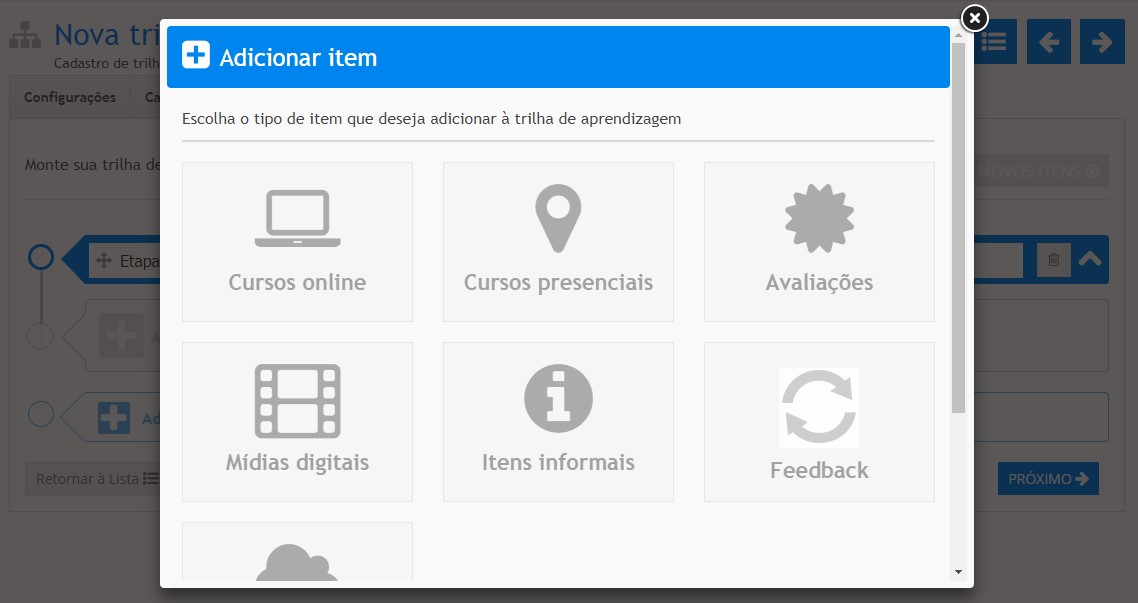 Após incluir as etapas em sua trilha, clique em Adicionar novo item para escolher os itens que deverão compor esta etapa da Trilha. Conforme podemos observar na tela abaixo, o sistema apresentará a você as opções disponíveis para inclusão: