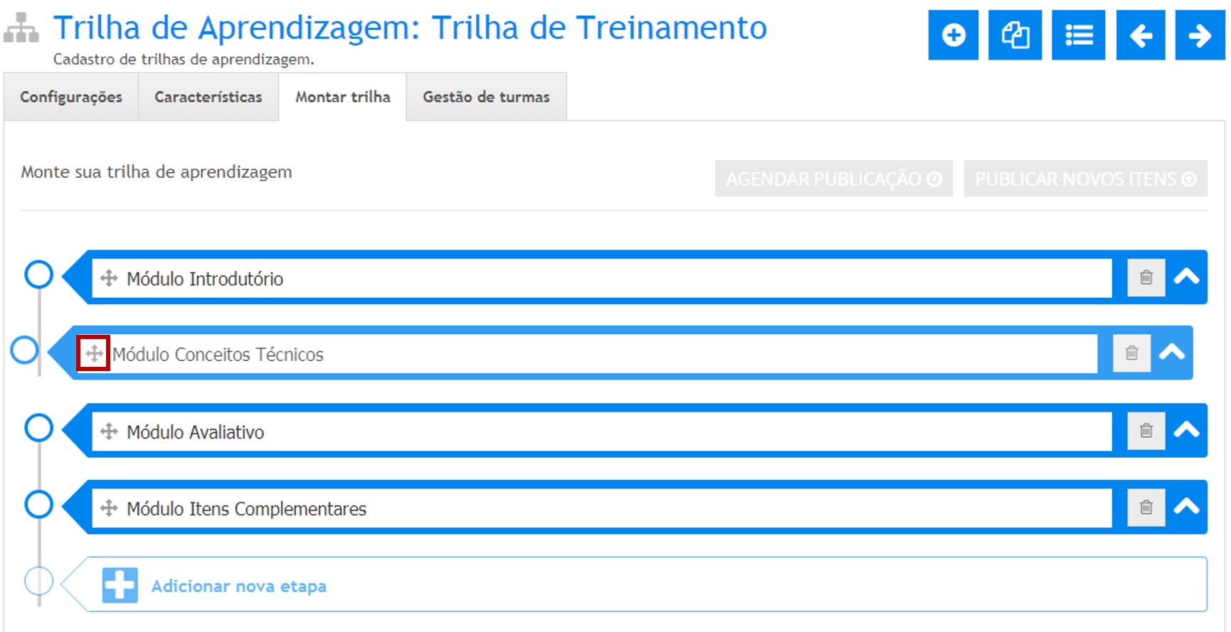 Espaço onde você irá definir quantidade e ordem de etapas e quais itens educacionais serão apresentados ao aluno na trilha.