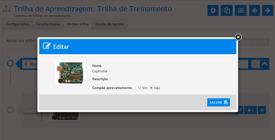 Uma vez incluídos em uma etapa, tanto os cursos online quanto os cursos presenciais poderão ser configurados para compor ou não aproveitamento na Trilha de Aprendizagem. Para tanto, basta clicar sobre o ícone “Editar” de ambos. Uma nova tela será exibida, como no exemplo abaixo: