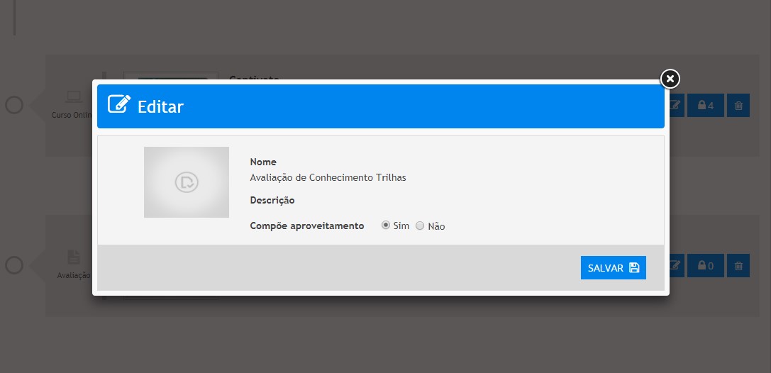 Uma vez incluída em uma etapa, a Avaliação avulsa ou Avaliação 2.0 poderá ser configurada para compor ou não aproveitamento na Trilha de Aprendizagem. Para tanto, basta clicar sobre o ícone “Editar” correspondente a ela. A tela abaixo será exibida: