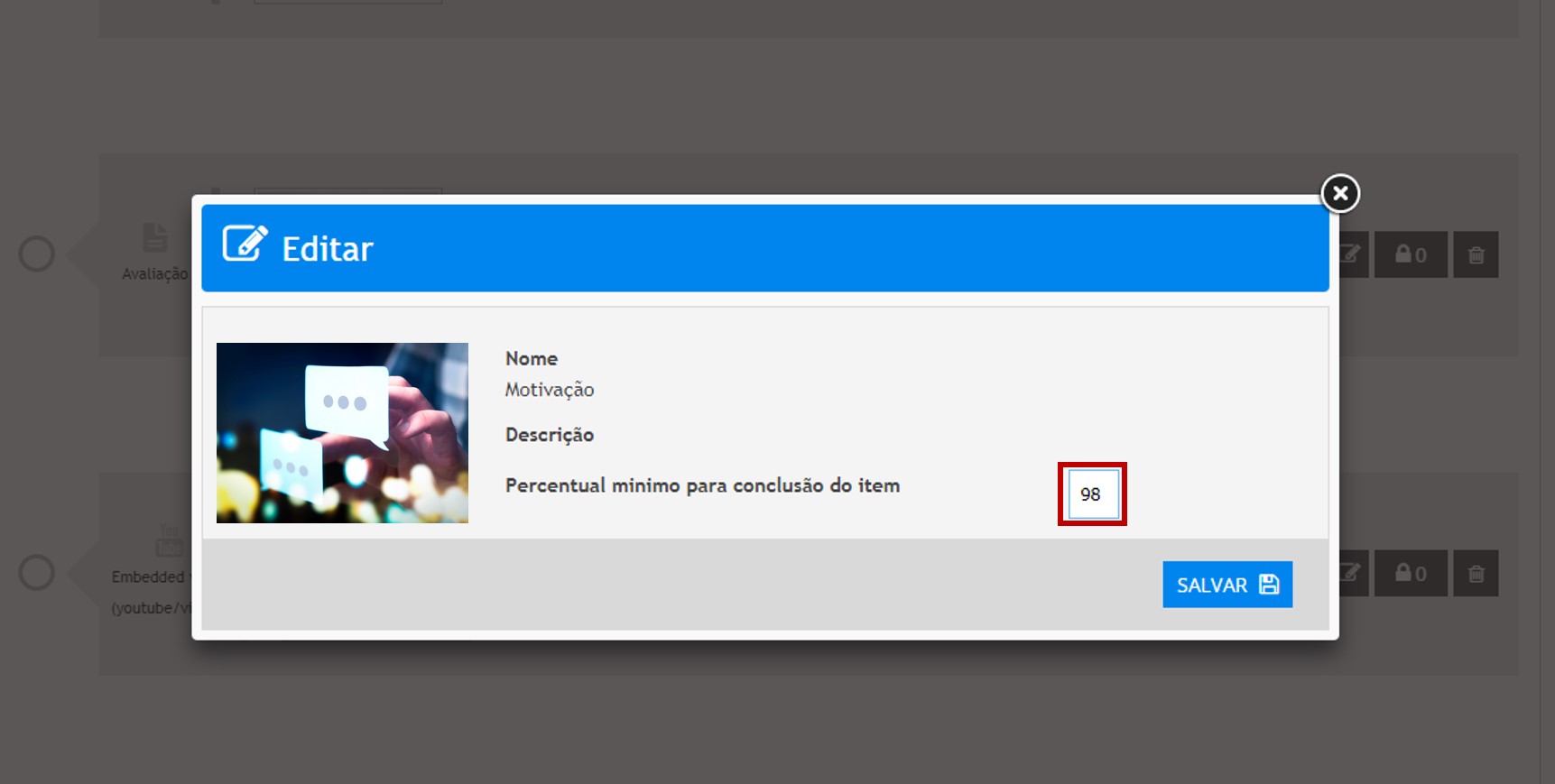 Uma vez incluída em uma etapa, as mídias digitais passam a compor o percentual de conclusão de uma trilha de aprendizagem. Todas as opções de Mídias que o sistema permite cadastrar através do caminho Conteúdo » Mídia Digital » Cadastro de Arquivos, podem ser utilizadas em uma etapa. Caso opte por utilizar uma mídia do formato “Vídeo“, o administrador poderá definir o percentual mínimo de visualização que o aluno terá que cumprir para ter o status de conclusão aplicado ao vídeo. Para isto basta clicar no ícone “Editar“, e informar o percentual conforme mostra a imagem abaixo: