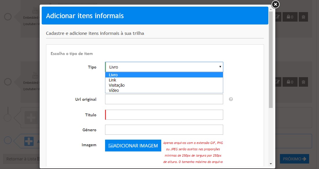 - Tipo: é possível cadastrar quatro opções diferentes de itens informais: livro, link, visitação ou vídeo. Alguns campos do formulário de cadastro do item serão alterados de acordo com o tipo escolhido, para que você possa configurar os seus detalhes: