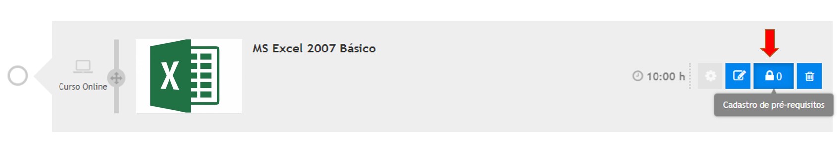 Quaisquer itens adicionados às etapas de uma Trilha de Aprendizagem, sejam cursos online e presenciais, Avaliações, Mídias Digitais ou itens informais, poderão ser configurados para possuírem pré-requisitos entre eles. Para isso, basta clicar sobre o ícone “Cadastro de pré-requisitos” (em destaque na figura abaixo) correspondente ao item para o qual deseja relacioná-los: