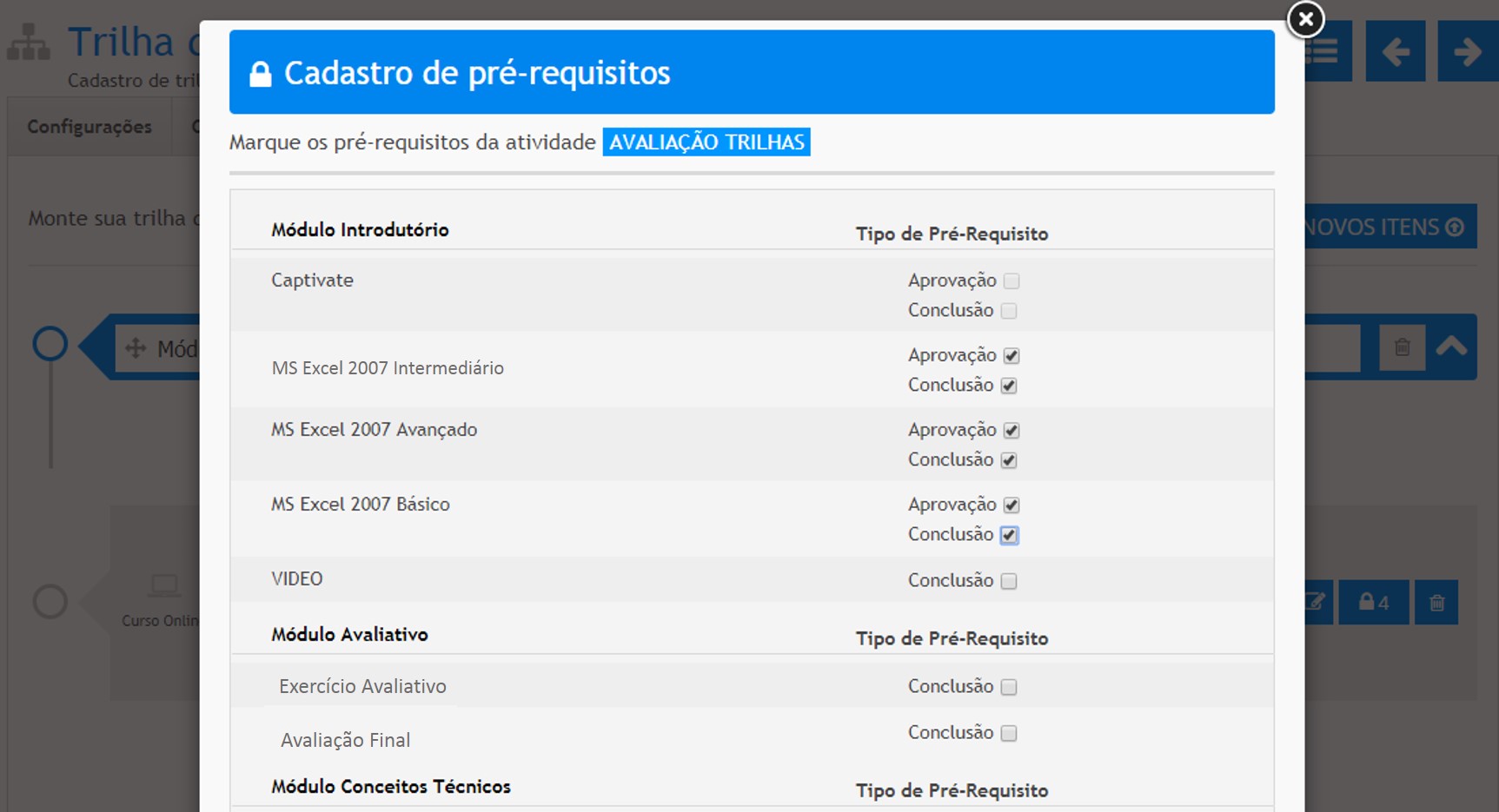 Configurações de pré-requisitos entre Trilhas de Aprendizagem