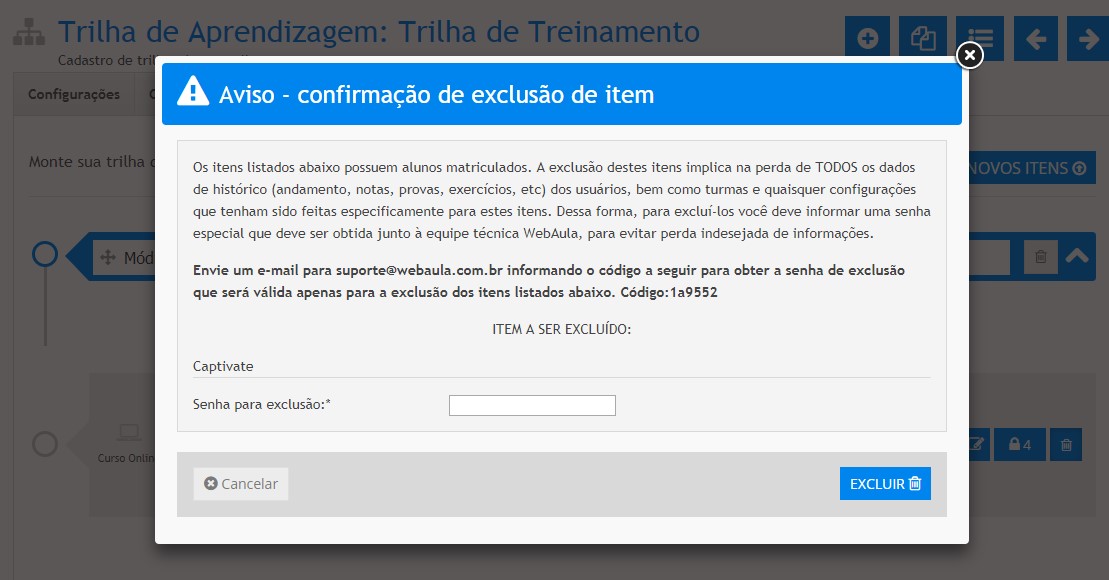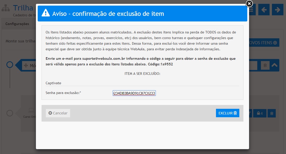 É importante salientar que, caso a trilha já possua uma turma criada, será necessário inserir uma senha de autorização para que a exclusão seja efetivada. Conforme a tela abaixo: