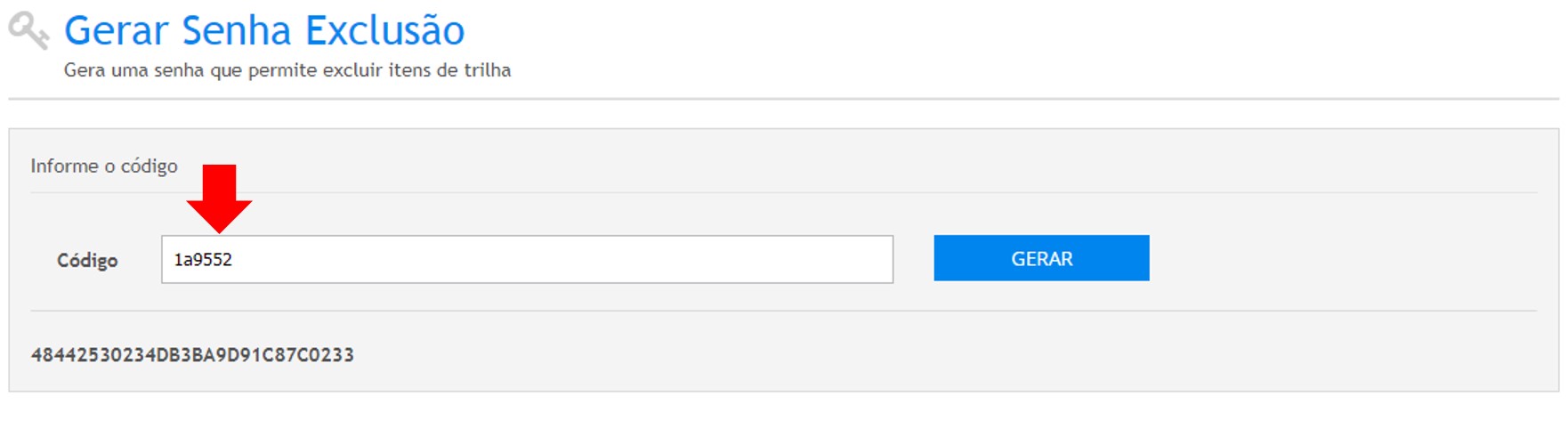 Copie o código informado na tela acima e acesse o caminho: Conteúdo » Trilhas de Aprendizagem 2.0 » Gerar senha de exclusão. O sistema irá apresentar a seguinte tela: