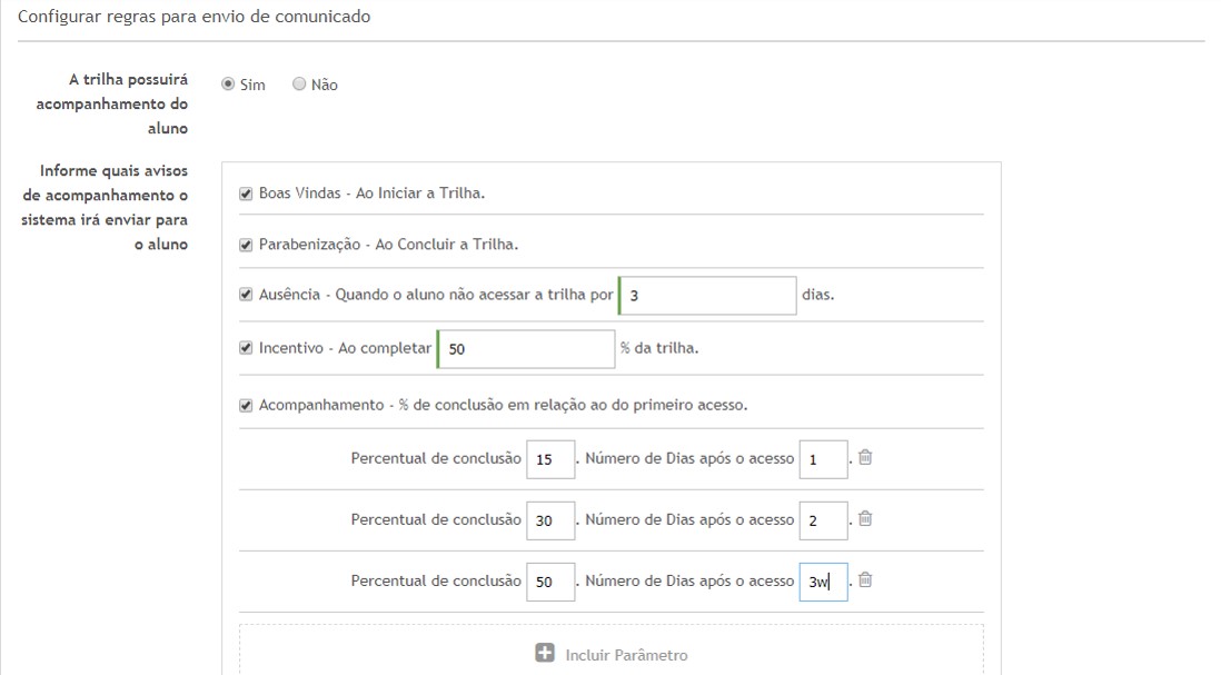% de conclusão em relação ao primeiro acesso: clique no botão Incluir Parâmetro para definir o percentual de conclusão que deverá ser atingido pelo aluno dentro de uma quantidade de dias específica após o seu primeiro acesso, para que ele receba esta notificação. Obs.: É possível definir mais de um parâmetro.