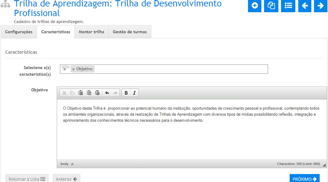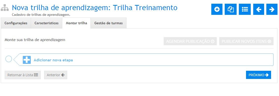 - Após configurar os campos acima, acione o botão Próximo para salvar as configurações da nova Trilha.