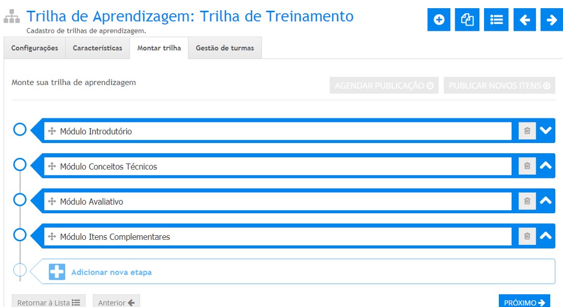 Pronto, agora que passamos por todos os passos possíveis na criação de uma Trilha, vamos avançar para a última etapa. Após configurar todos os itens que deseja possuir nas etapas de uma Trilha de Aprendizagem, acione o botão Próximo para salvá-los e iniciar a gestão de turmas.