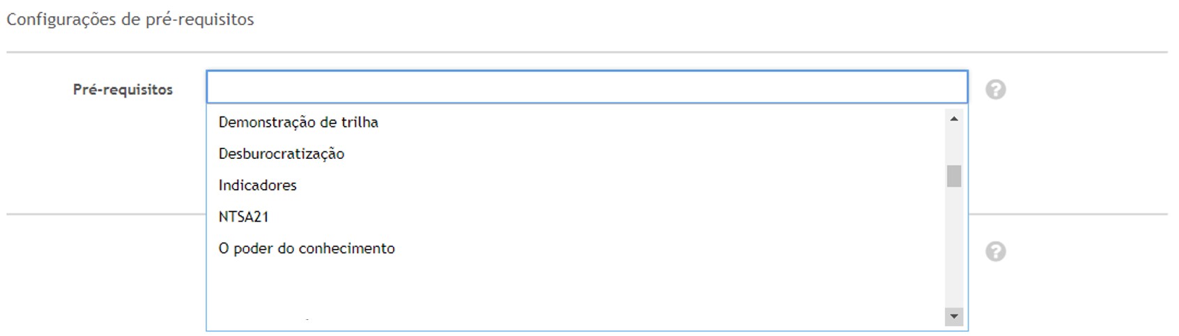 Para estabelecer Pré-Requisitos entre Trilhas de Aprendizagem, clique na caixa de seleção, o combo irá carregar todas as Trilhas existentes para que dentre elas, você possa definir quais serão Pré-Requisito para que o aluno tenha acesso a trilha que você estiver cadastrando.