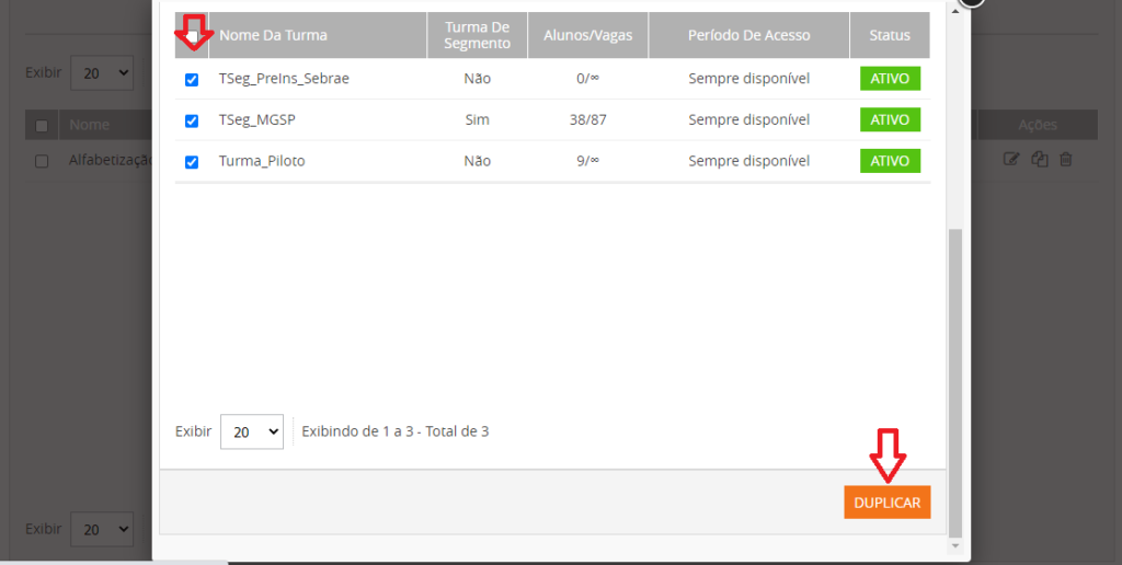 Em seguida selecione as turmas da Trilha que será duplicada. Clique em Duplicar.