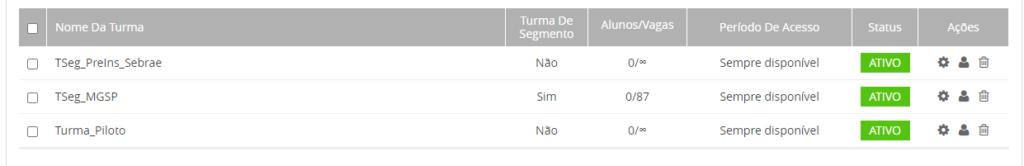 Última aba, onde você irá criar as turmas da Trilha que estiver cadastrando, assim como matricular e/ou excluir alunos da turma.