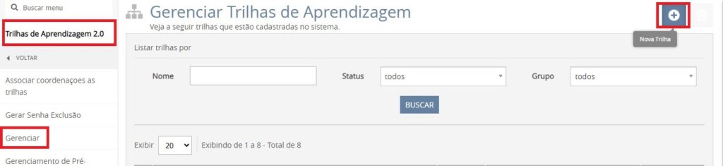 Para criar uma trilha de aprendizagem, vá ao menu Conteúdo » Trilhas de Aprendizagem 2.0 » Gerenciar, clique no ícone “Nova trilha”.