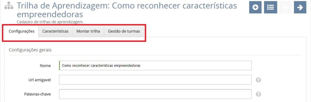 Agora que entendemos o conceito de cada aba, vamos iniciar o cadastro de nossa trilha, na Aba “Configurações” . Para isso, vamos realizar as ações abaixo.