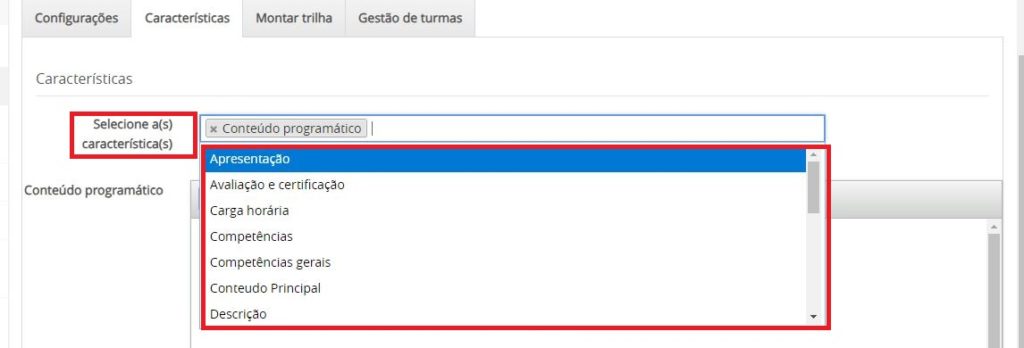 Obs.: A característica “Conteúdo programático” é necessária ser informada, para que esta, seja exibida no conteúdo programático do certificado avulso, ou seja, no certificado da trilha.