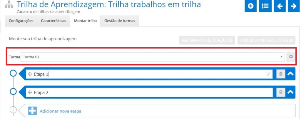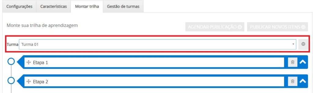 Na aba Gestão de turma são exibidas todas as turmas selecionadas na duplicação da trilha, com todas as configurações da trilha anterior, bem como todos os itens/ etapas da trilha.