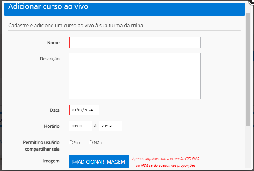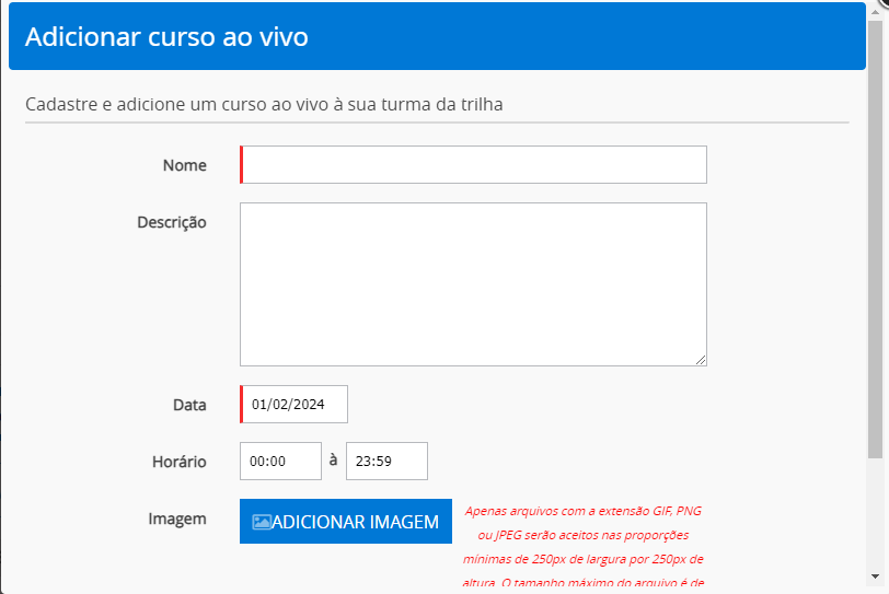 Para inserir Cursos ao Vivo, o sistema disponibilizará um formulário para o cadastro.
