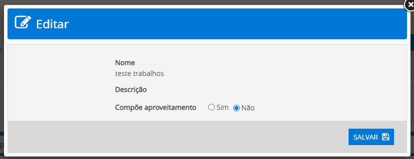 Configure-a e acione o botão Salvar. Obs.: Por padrão, Avaliações virão com a opção “Sim” selecionada para o parâmetro “Compõe aproveitamento”.