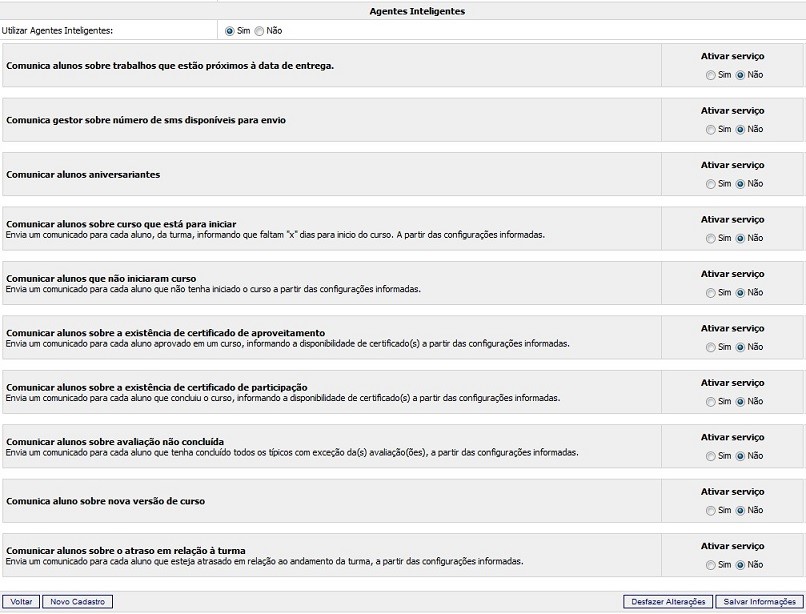 - Utilizar Agentes Inteligentes: caso queira utilizar os Agentes Inteligentes, isto é, as mensagens automáticas para alertar os alunos sobre determinados itens pendentes ou disponíveis na turma de curso, marque a opção “Sim”. A área para configuração dos e-mails será exibida. Para não habilitar o recurso, marque “Não”.