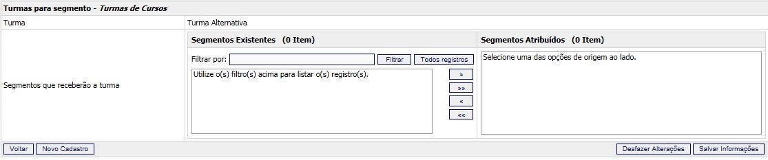 - Na combo “Segmentos Existentes”, selecione os segmentos a serem atribuídos à turma de curso.